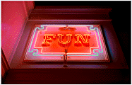 Bright reds, magentas, yellows and blues make up this strong image of a neon sign at the amusement park. The intense shadows and strong lighting make it appear three-dimensional, while the overall texture of the film grain lends a pointillistic quality.